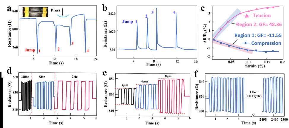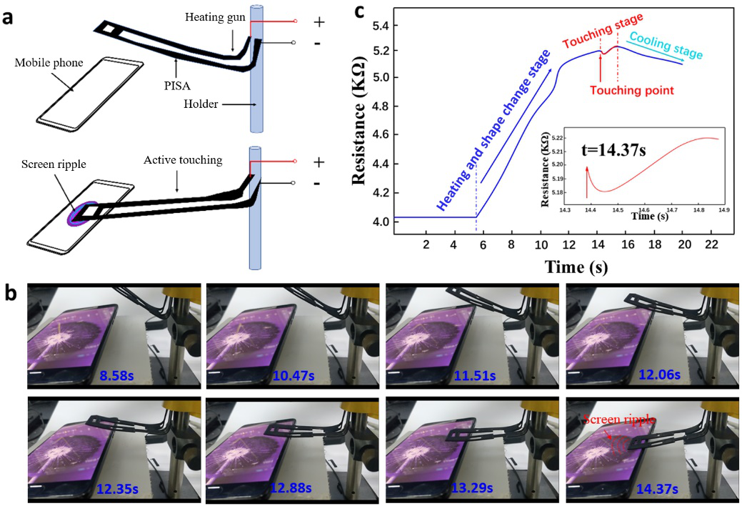 基于此,研究者将该仿生4D打印器件应用于模拟手指触碰手机屏幕(如图6所示)。在温度激励下器件形状改变,模拟手指主动触碰屏幕,在这个过程中器件形变引起其缝结构间距的变化使器件整体电阻改变,实现器件形状变化自感知。在触碰瞬间,可通过电阻的变化检测到器件触碰屏幕的应力,实现触碰应变自感知。