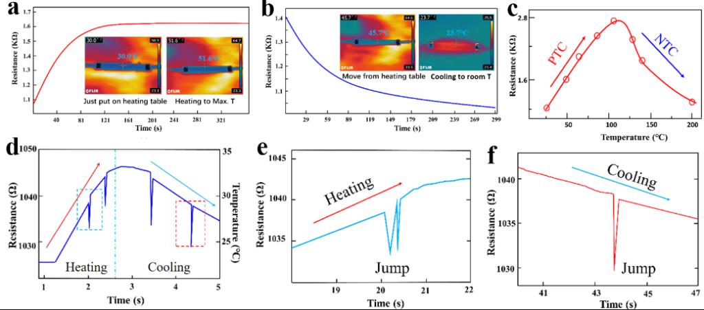 封面文章题为“4D Printing Strain Self‐Sensing and Temperature Self‐Sensing Integrated Sensor-Actuator with Bioinspired Gradient Gaps”,通过材料-结构-功能一体化4D打印,创造性的在材料水平上实现了传感/执行一体化功能。传感/执行一体化原理:炭黑纳米粒子/PLA复合材料具有良好的导电性能和形状记忆效应,该材料的4D打印器件加热后可发生可控形状变化。在加热过程中,由于炭黑纳米粒子与PLA的膨胀率不同,炭黑纳米粒子间的距离改变引起电子遂穿效应变化,使器件电阻改变,从而将热信号转变为电阻信号实现温度自感知(如图4所示);同时,器件在形状改变过程中,器件缝结构周边的炭黑纳米粒子会接触-分离,器件内局部接触电阻变化使器件的电阻改变,从而将自身形变信号转变为电阻信号实现应变自感知(如图5所示)。