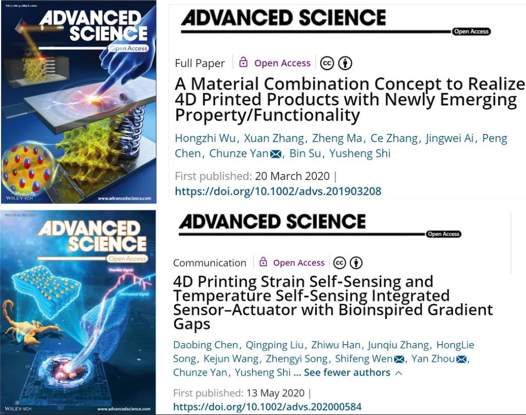 为此,在华中科技大学“4D打印”学术前沿青年团队项目的支持下,史玉升教授团队提出材料组合的思想制备柔性4D打印器件,为性能变化、功能变化的4D打印提供了新的思路和方法,相关成果以封面文章发表在Advanced Science上;为解决传感/执行一体化的难题,史玉升教授团队受蝎子缝感受器超敏缝结构的启发,仿生设计出梯度缝结构,4D打印炭黑纳米粒子/聚乳酸(PLA)复合材料,成形出具有自主形变并能自感知应变和温度的仿生缝结构器件,实现了传感/执行一体化功能,相关成果以封面文章发表在Advanced Science上。