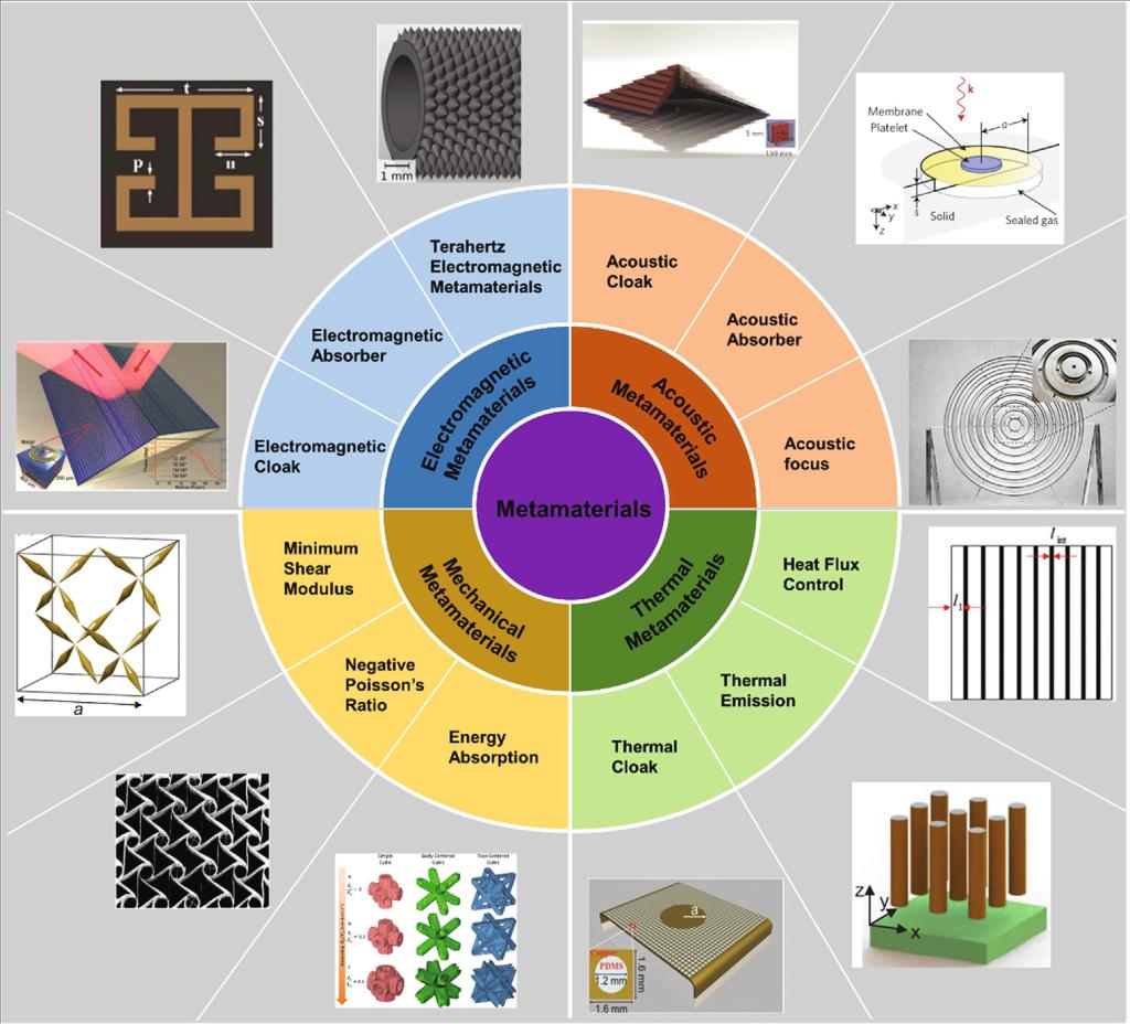 近年来,超材料受到越来越多科研工作者的关注,各种各样具有不同物理特性的超材料被设计出来。根据超材料的功能不同,目前超材料大致可分为四类:电磁超材料、声学超材料、热学超材料和机械超材料,根据其具体的原理和应用领域不同,将上述四类超材料进一步细分为:(1)电磁隐身超材料、电磁吸收超材料、太赫兹电磁超材料等;(2)声隐身超材料、声波吸收超材料、声波聚焦超材料等;(3)热流控制超材料、热隐身超材料和热辐射超材料等;(4)吸能超材料、负泊松比超材料、最大体模量超材料等,如图1所示。