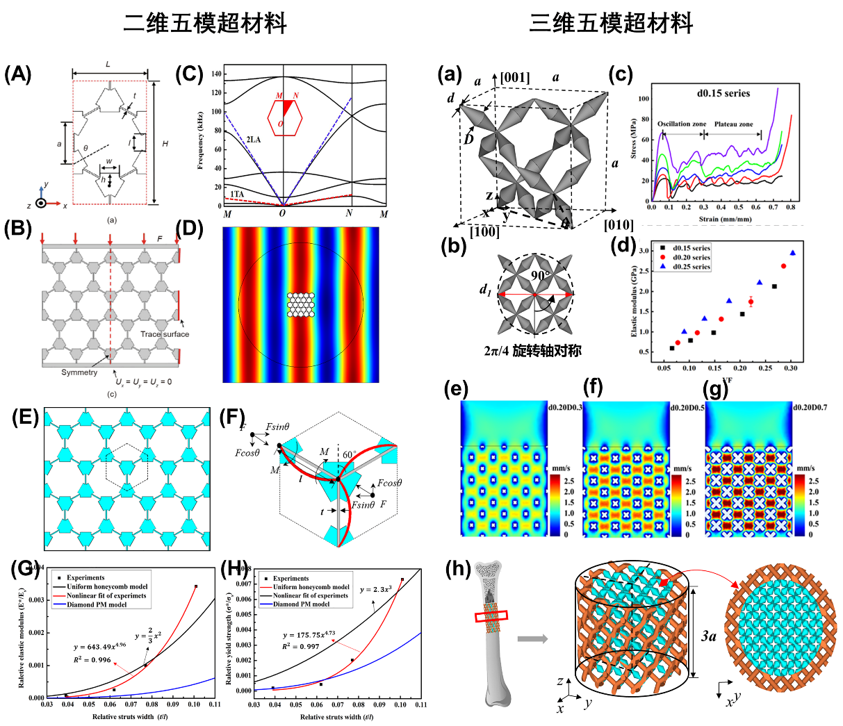 图3.增材制造的五模超材料。二维五模超材料(A-B)结构构型与单胞;(C)频散曲线;(D)声场模拟;(E-F)理论力学受力分析结果;(G)相对模量和(H)相对强度与相对密度的关系曲线;三维五模超材料(a-b)结构构型与单胞;(c)压缩应力应变曲线;(d)压缩模量与体积分数的关系;(e-g)不同构型超材料传质过程速度分布云图;(h)复合五模超材料生物支架结构