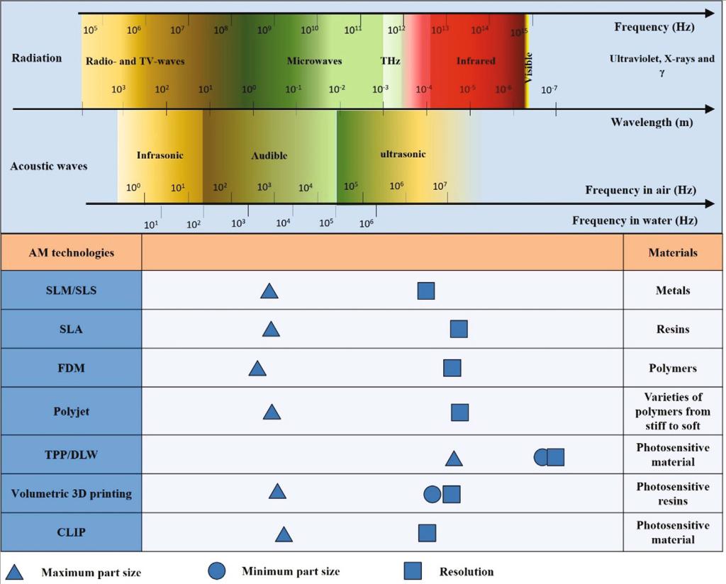 图2. 典型增材制造工艺在成形各种尺寸超材料时的特点。三角形、圆形和正方形分别表示最大零件尺寸、最小零件尺寸和成形分辨率,符号的位置表示与波长对应的尺寸,两个符号之间的距离表示各种增材制造技术可实现的单元数量。