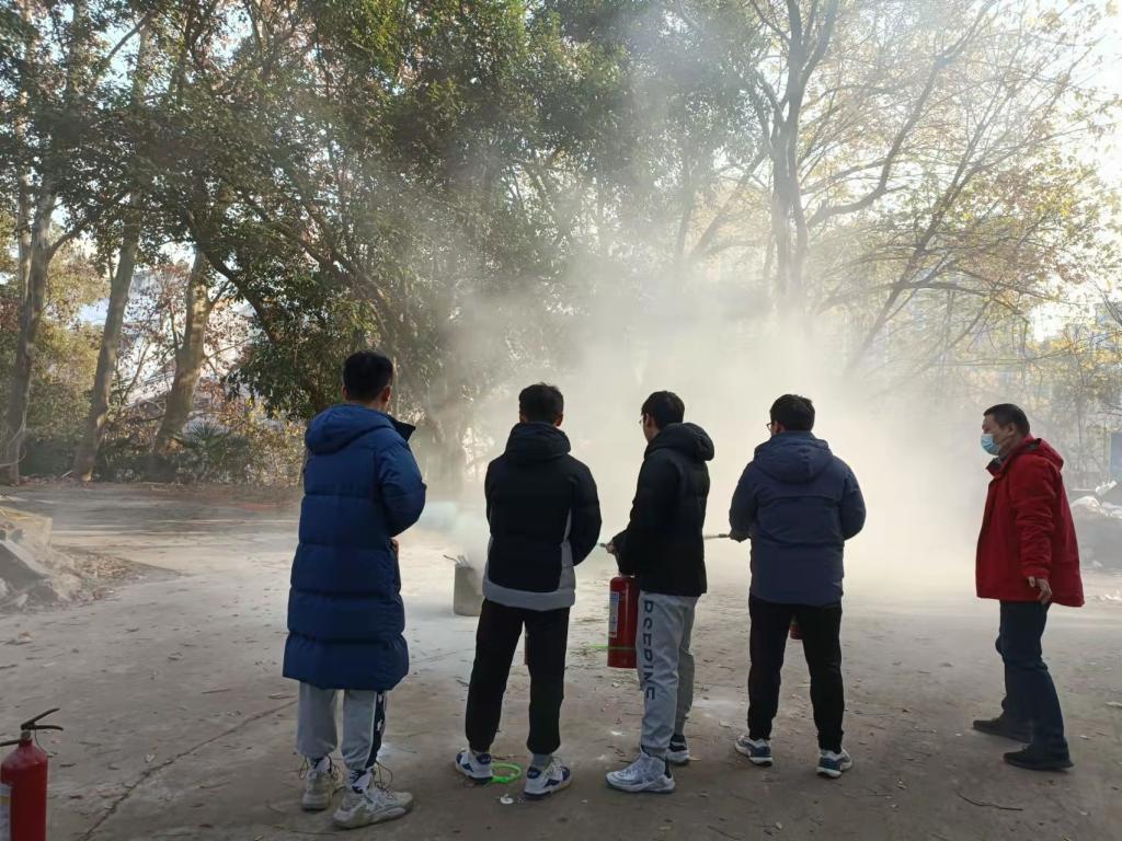在前期踩点之后,郑明皞老师将培训的地点确定在防伪中心对面的清运场附近。2021年12月21日下午3点钟,消防员和消防车就位,郑明皞老师对参加培训活动的师生详细讲解了干粉灭火器、二氧化碳灭火器的使用条件以及使用方法,并亲自演示了水带管接头的接法。随后,同学们分成四组踊跃上前练习“一提(提起灭火器)、二拔(拔掉保险销)、三握(握住喷管最前端)、四对(对准火焰根部)、五喷(往下按压阀,对准火焰左右喷射)”。二氧化碳灭火器可以隔绝空气,一般在密闭空间使用,用来扑救贵重设备、档案资料、仪器仪表、600伏以下电气设备及油类引起的火灾,郑老师特别强调二氧化碳灭火器使用时一定要握住喇叭型喷筒的位置,以免发生冻伤。