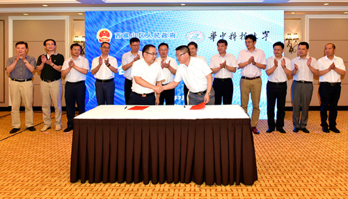 7月31日,华中科技大学与黄石市政府战略合作协议签约仪式举行。黄石市委副书记、市长董卫民,校长丁烈云分别代表双方签约。校领导马小洁、张新亮,黄石市领导杨军、叶战…