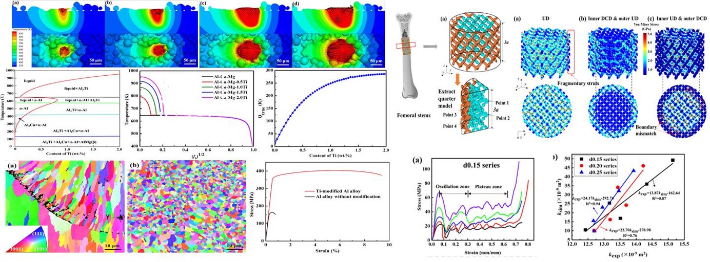 增材制造材料与结构设计:研制出集成三维测量和测温的在线检测SLM激光3D打印装备,实现金属材料冶金过程监测和在线工艺调控,为形性协同调控的高性能复杂构件成形提供技术支撑。基于材料计算,建立面向SLM非平衡凝固过程的专用合金及其复合材料成分设计方法,解决金属材料SLM成形过程裂纹与组织各向异性难题。提出声学与承载性能兼备、力学与生物学性能并存的点阵结构超材料设计方法,实现金属构件的性能调控,并在航空航天、生物医学领域开展应用研究。