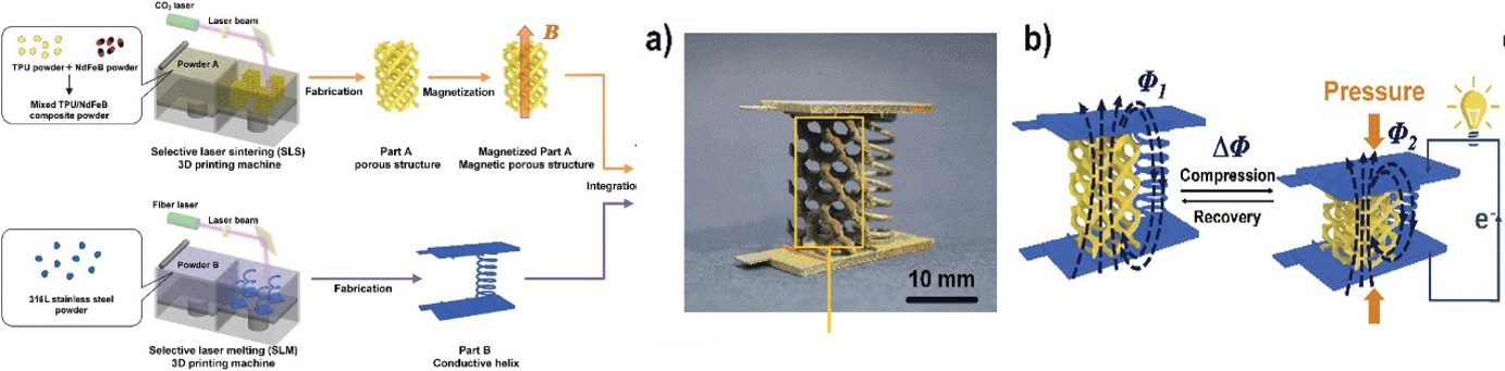 4D打印技术:4D打印是智能构件的增材制造技术,2013年美国人提出“构件的形状随时间变化”的4D打印定义,本中心将4D打印内涵拓展到“智能构件的形状、性能和功能随时空变化”,主办三届“4D打印技术论坛”,推动我国增材制造由追求“稳定”的3D打印走向“变化”的4D打印。提出了一种材料组合概念,来构造性能/功能可控变化的4D打印磁电转化器件。该器件由导电和磁性部件组成,集成后的装置可以显示压电特性。因此,基于电磁引入原理,装置被赋予将机械能转换为电能的能力。